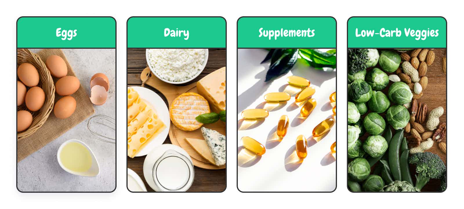 For low-carb vegetables, try kale, broccoli, cauliflower, brussels sprouts, asparagus, spinach, lettuce, and other leafy greens. For healthy fats, try olive oil, avocado oil, coconut oil, butter, ghee, and red palm oil. Mix and match to suit your taste buds.